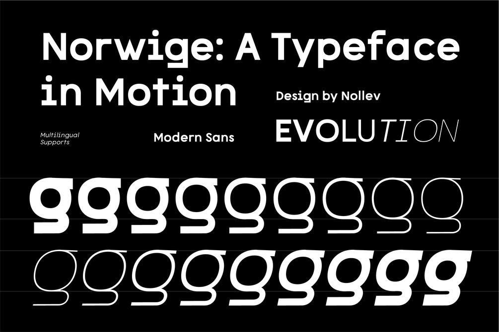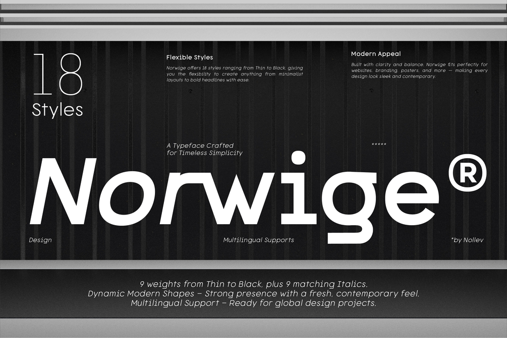 Norwige is a modern dynamic sans-serif family designed with clean geometry and lively energy. With 18 versatile styles — from Thin to Black, plus matching Italics — Norwige is perfect for bold branding, editorial layouts, and digital experiences.